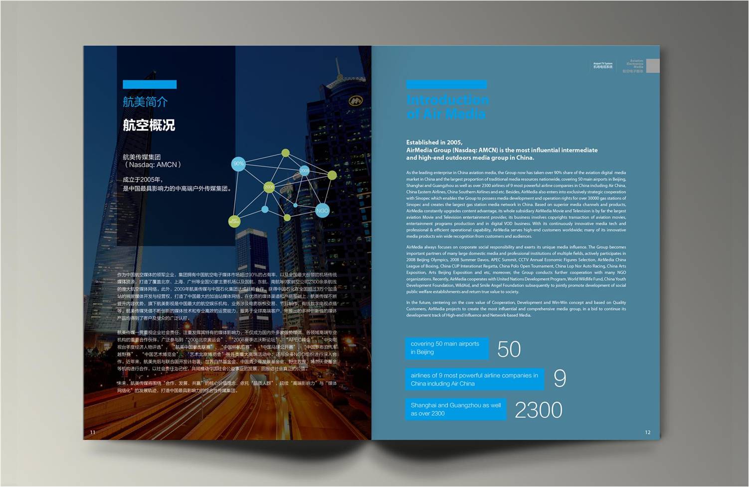 航美传媒(Airmedia)是中国第一大航空媒体运营商[1] ,占有中国航空数码媒体超过90%的市场份额,同时掌握着国内重要机场的传统媒体资源,在中国户外媒体行业独家提供“电子+传统”双媒体战术解决方案,打造了覆盖北京、上海、广州等全国主要机场的航空媒体网络。